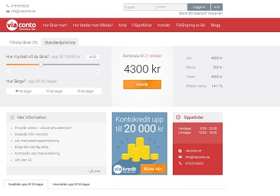 ViaConto är företaget som vänder sig till kunder som behöver låna ett mindre belopp. Lånen som de erbjuder är sms-lån med en genomsnittlig kostnad för branschen. Här kan du låna mellan 500 kr och 10 000 kr. Dessutom kräver inte detta företag någon fast anställning för låntagaren.